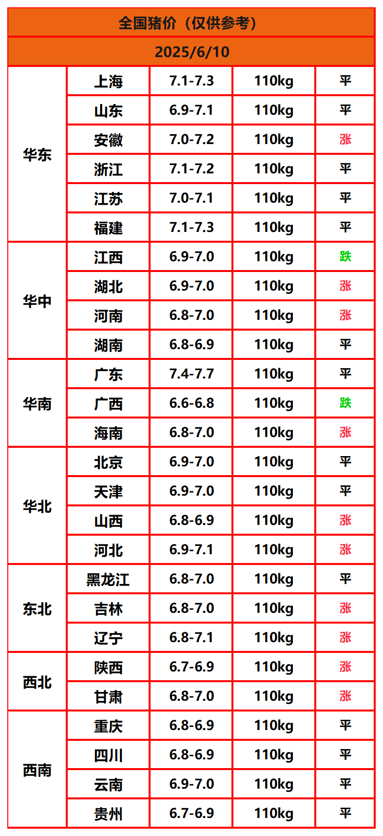 2025年6月10日猪价,今日全国猪价行情走势:10涨14平2跌。