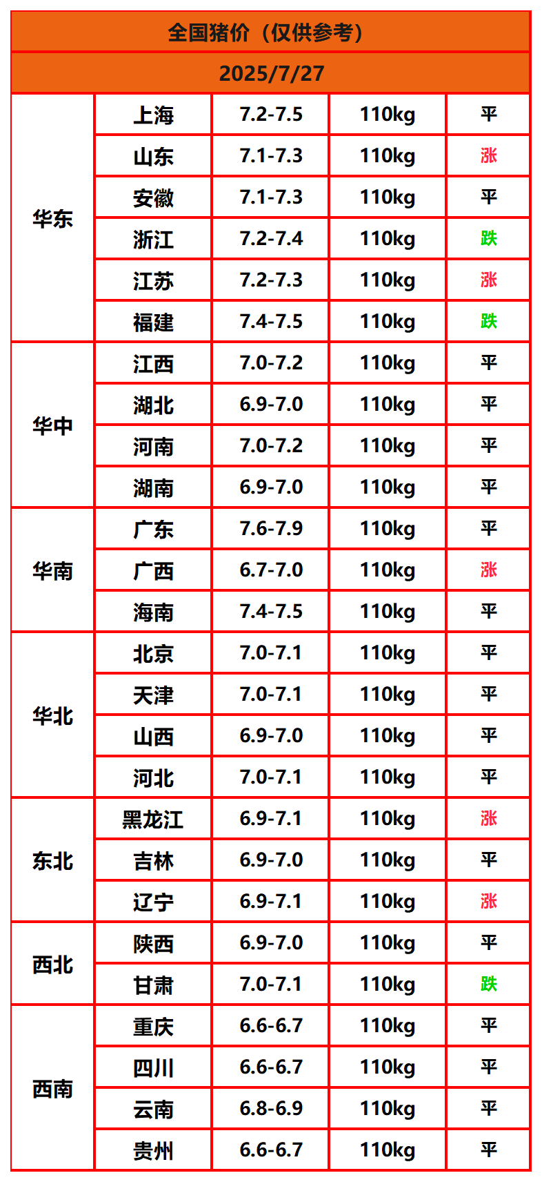 2025年7月26日猪价,今日全国猪价行情走势:5涨18平3跌。