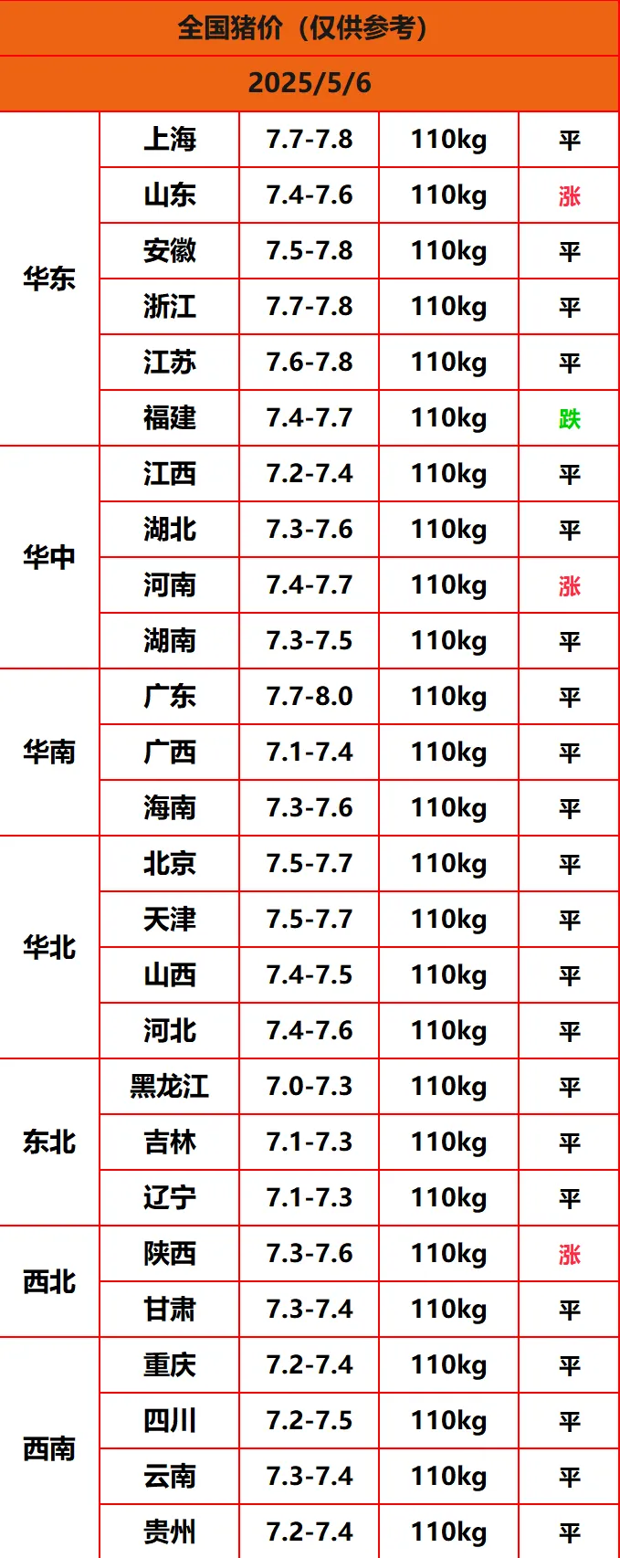 2025年5月6日猪价,今日全国猪价行情走势:3涨22平1跌。
