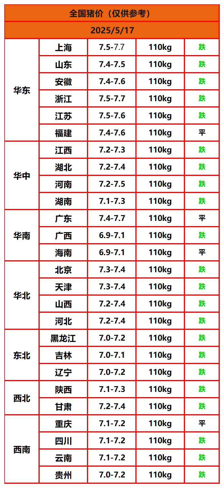 2025年5月17日猪价,今日全国猪价行情走势:0涨4平22跌。
