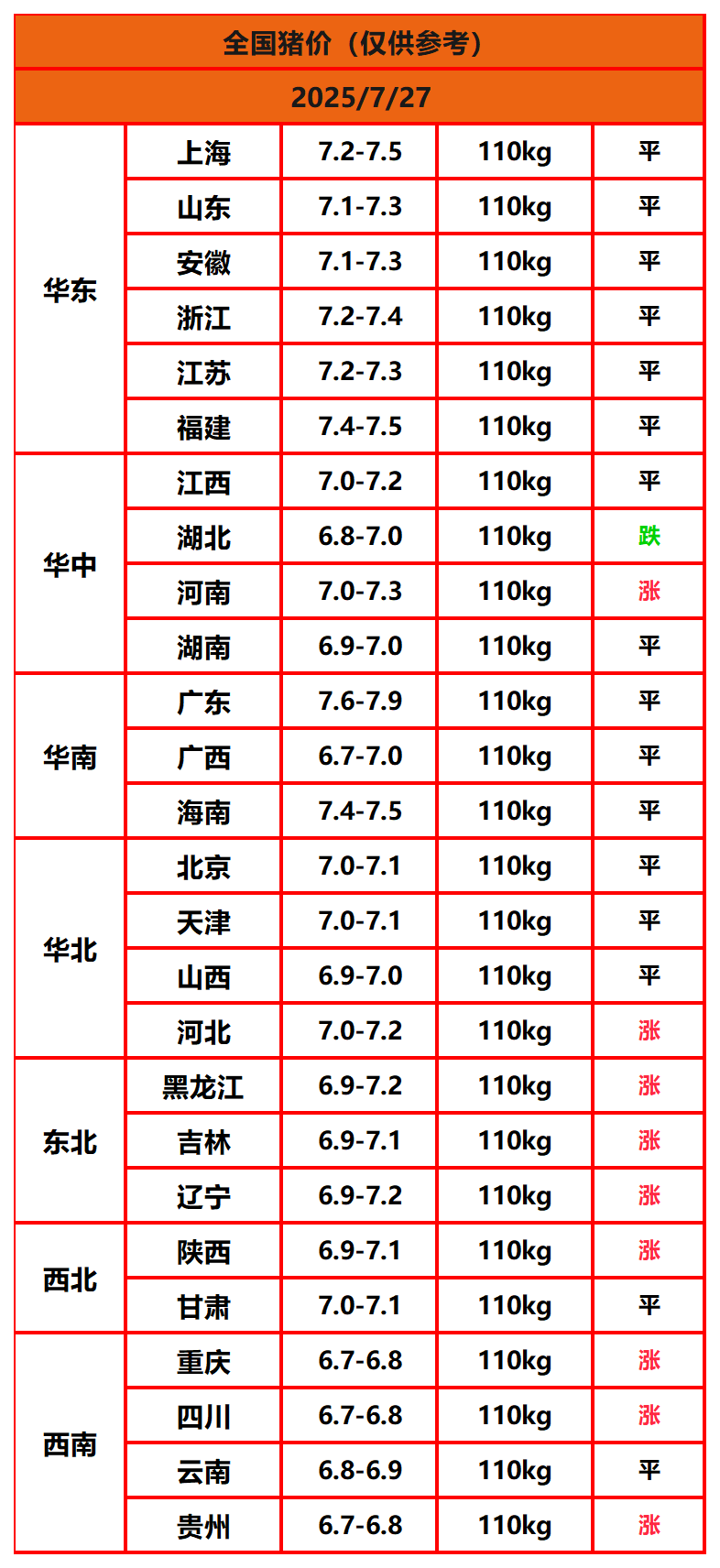 2025年7月27日猪价,今日全国猪价行情走势:9涨16平1跌。