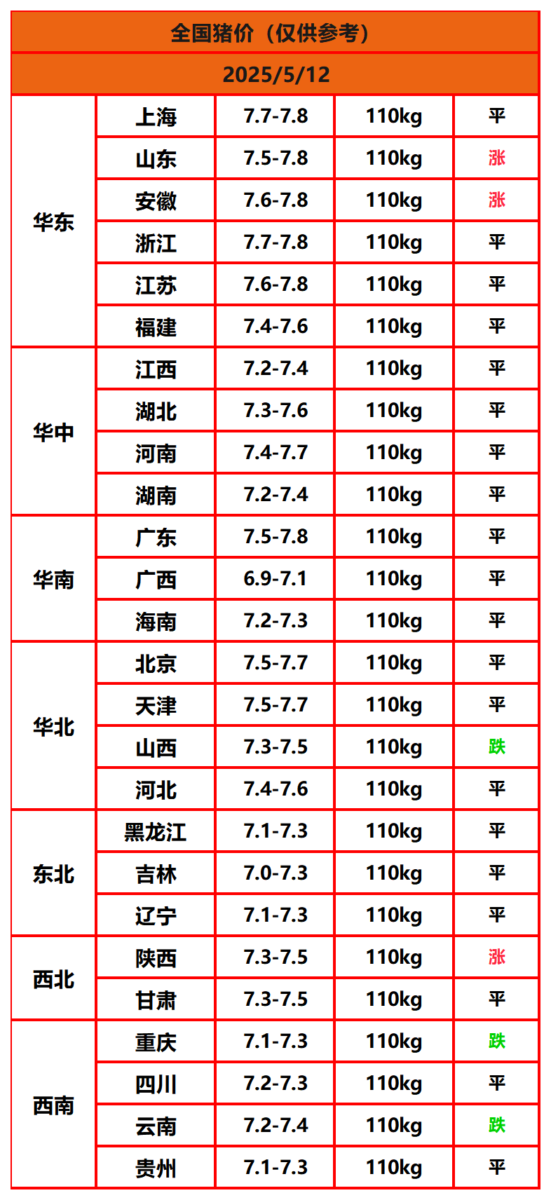 2025年5月12日猪价,今日全国猪价行情走势:3涨20平3跌。