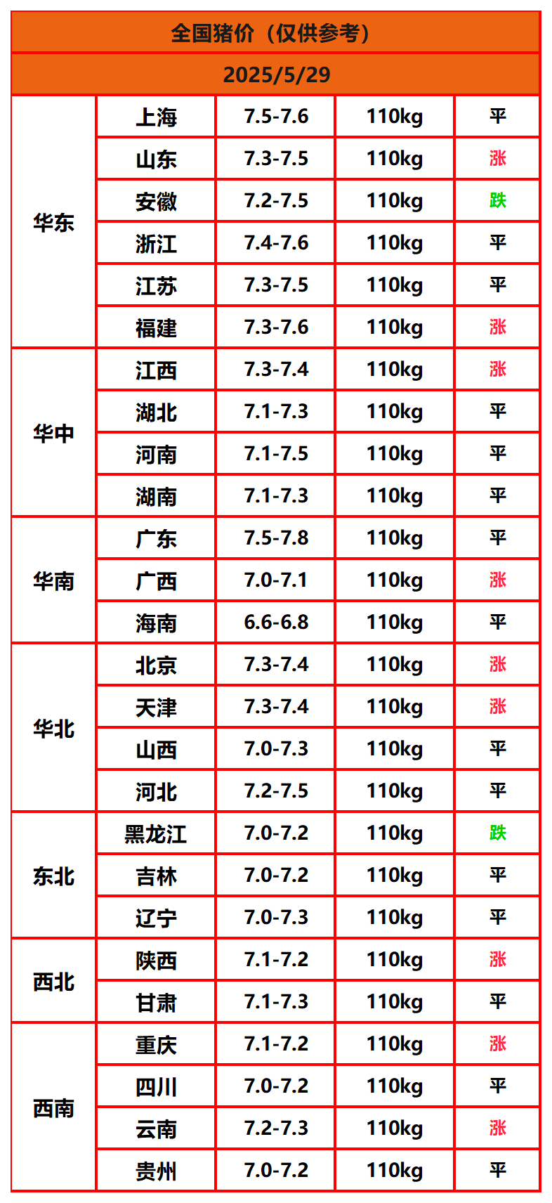 2025年5月29日猪价,今日全国猪价行情走势:9涨15平2跌。