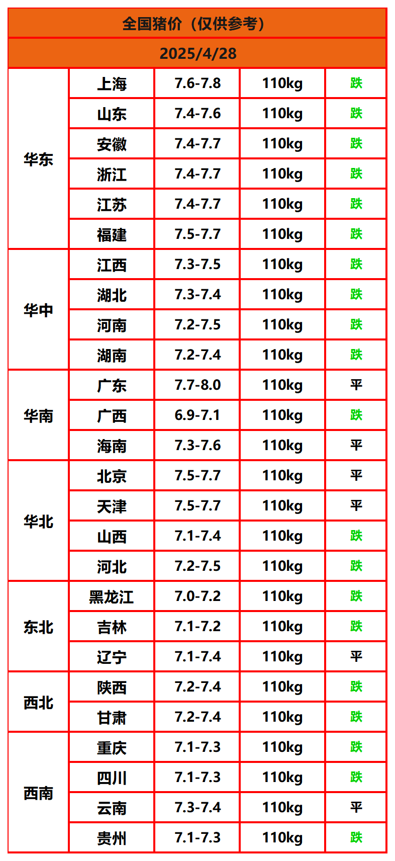 2025年4月28日猪价,今日全国猪价行情走势:0涨6平20跌。